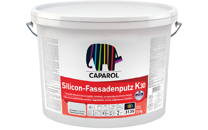 Caparol Silicon Fassadenputz, tencuiala structurabila pe baza de rasina siliconica, cu o structura tip R – „zgariata” sau tip K – „bob langa bob”, cu o inalta permeabilitate la vapori de apa.